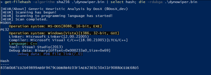 The sample analyzed in this post is a 32-bit Windows executable, and is version A of DynoWiper.